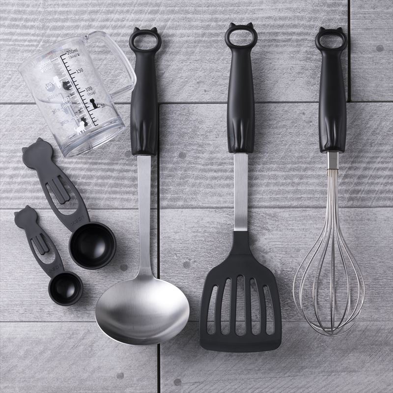 - “ねこと一緒に楽しくお料理!”当社売れ筋商品の性能を活かしつつ、キッチンの雰囲気を邪魔しない形でネコモチーフを取り入れました。ネコ好きの方もそうでない方も『欲しい!使いたい!』と思える、ほどよいネコ感を大切にしています。Nyammyシリーズの計量カップ(200ml)、計量スプーン、お玉、フライ返し、泡だて器が一式揃う、5点セットです。自宅用はもちろん、これから料理を始める方や一人暮らしの方、ネコ好きのご家族・ご友人への贈り物にもどうぞ♪