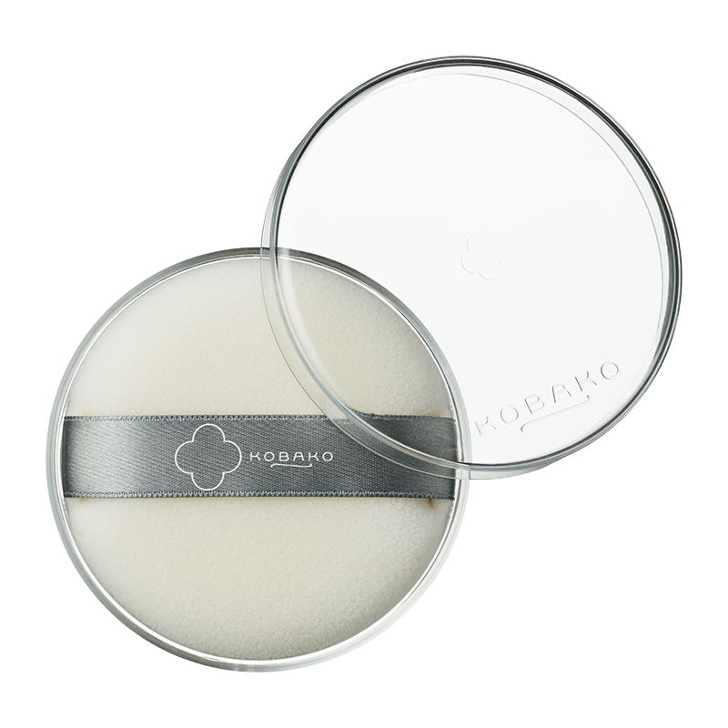 付属のハードケースは、パフ本体に1回分のパウダーを含ませて持ち運ぶことができます。内部の底面にKOBAKOの花モチーフをかたどった凸部分があり、パフに含ませたパウダーを少しだけ払って、適量に調節するのにぴったりです。