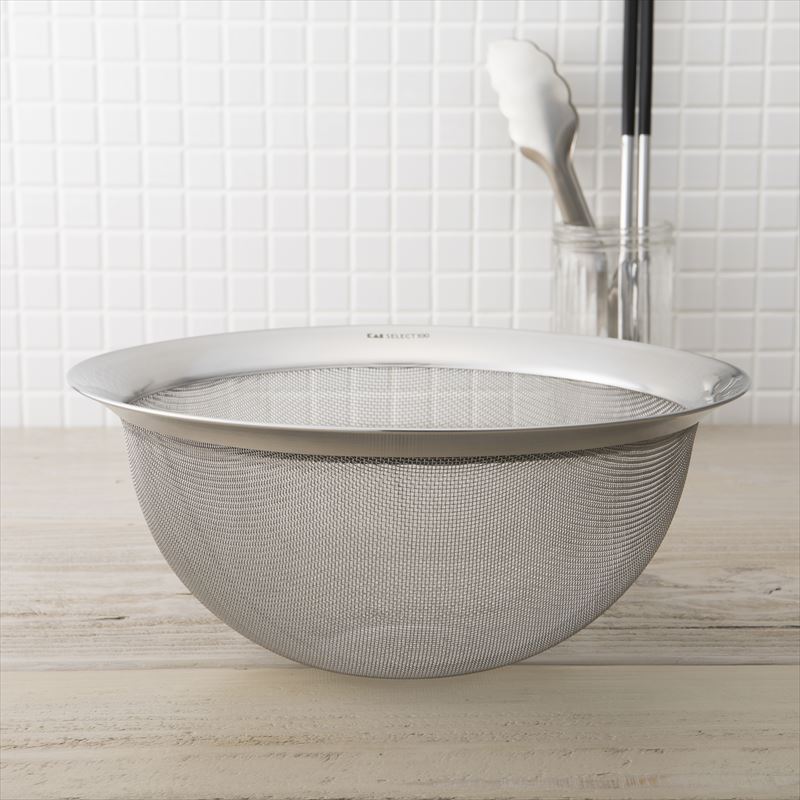 目詰まりしにくい網目、変形しにくく耐久性のある鋼材を採用しています。同サイズのボウル・ざる・浅型ざるは重ねて使用できます。