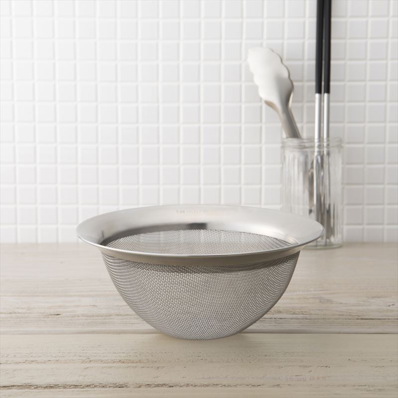 目詰まりしにくい網目、変形しにくく耐久性のある鋼材を採用しています。同サイズのボウル・ざる・浅型ざるは重ねて使用できます。