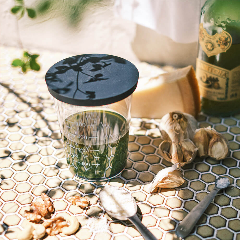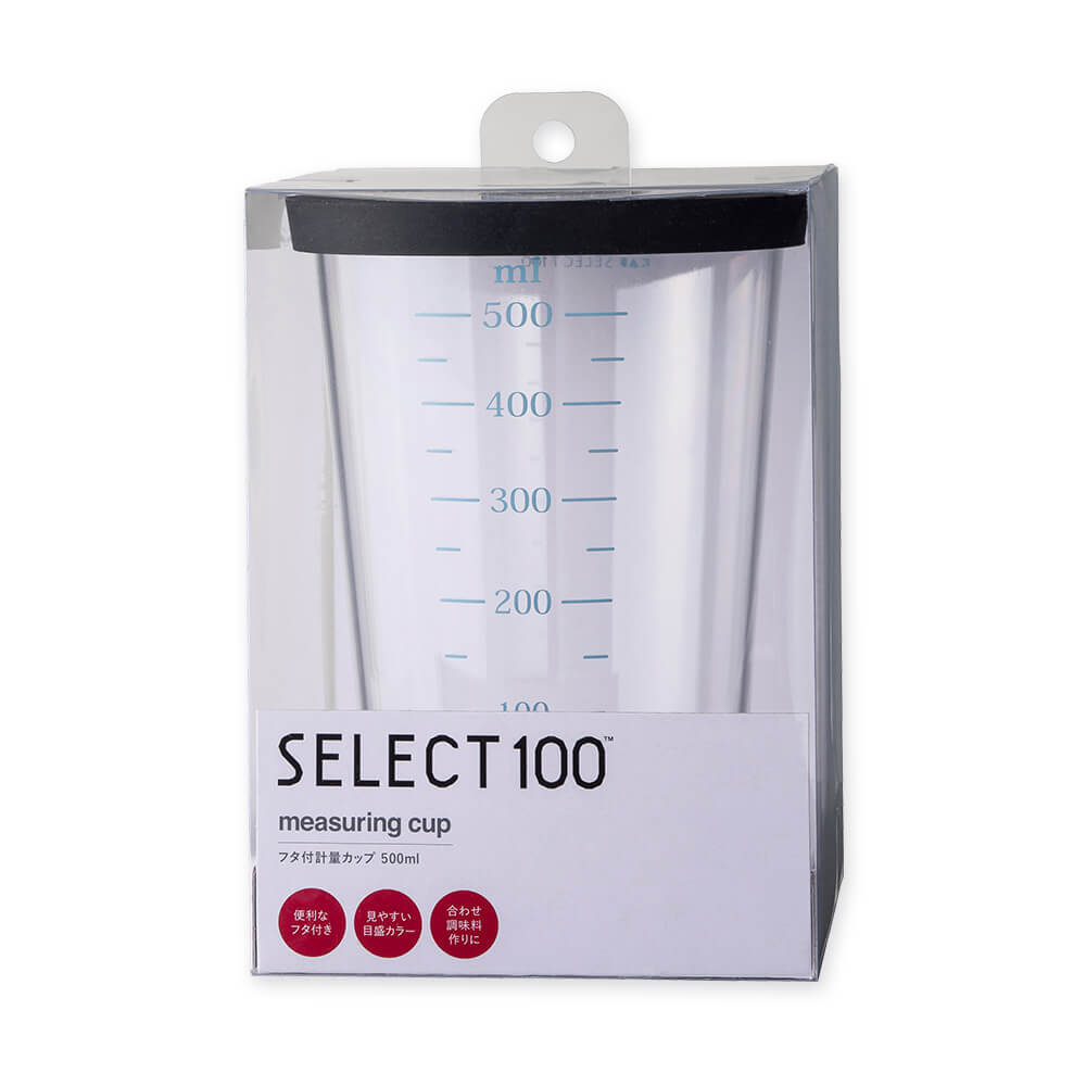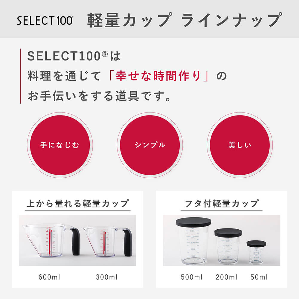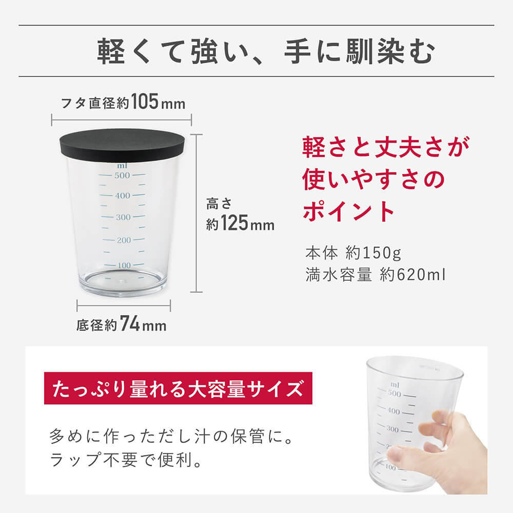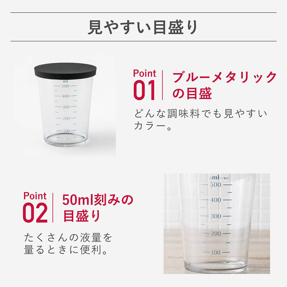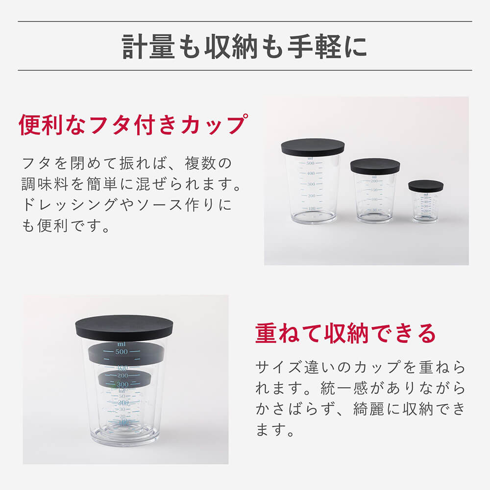 透明色・濃い色など問わず、全調味料が見やすいカラー目盛りの計量カップ。一時置きや重ね置きに便利なフタ付きです。