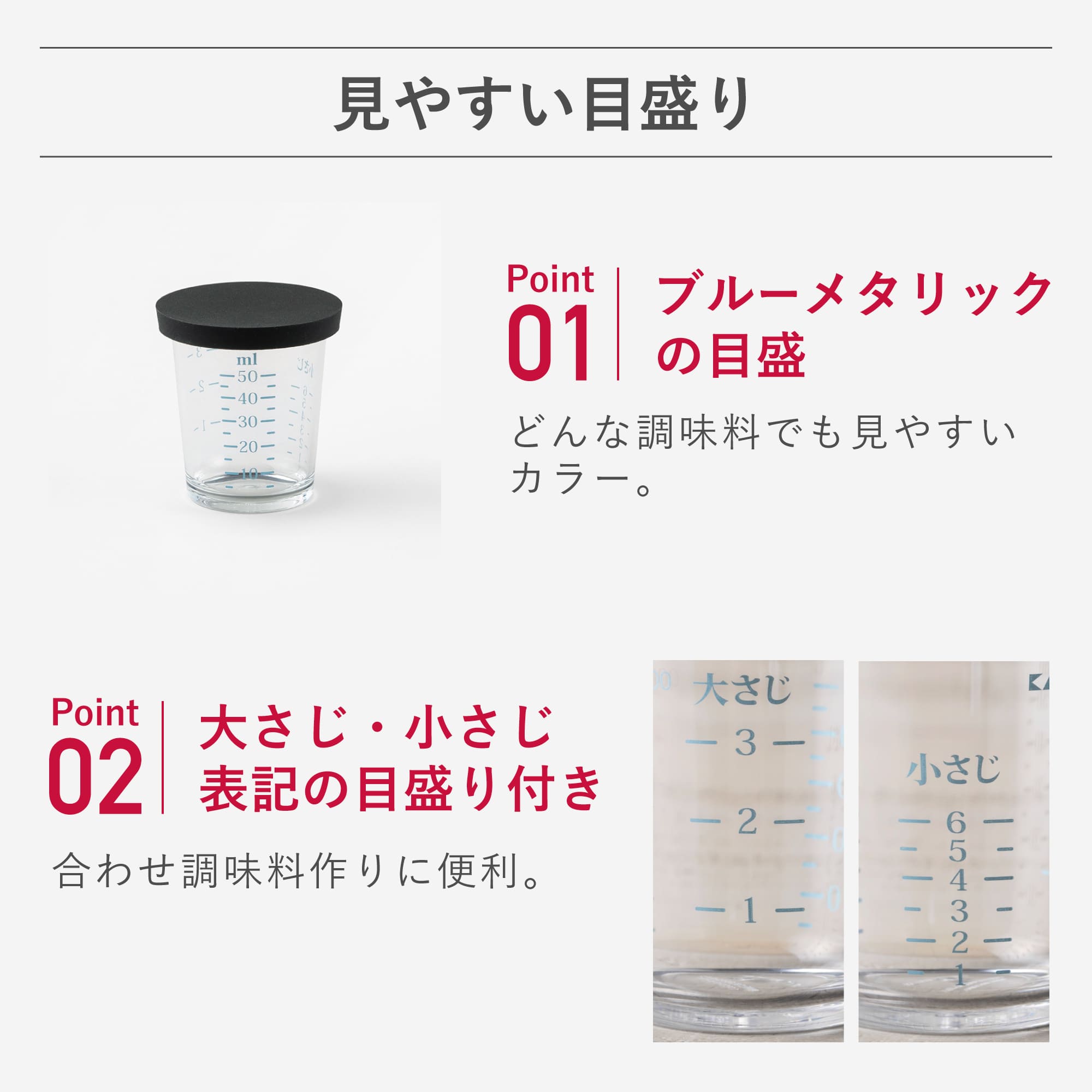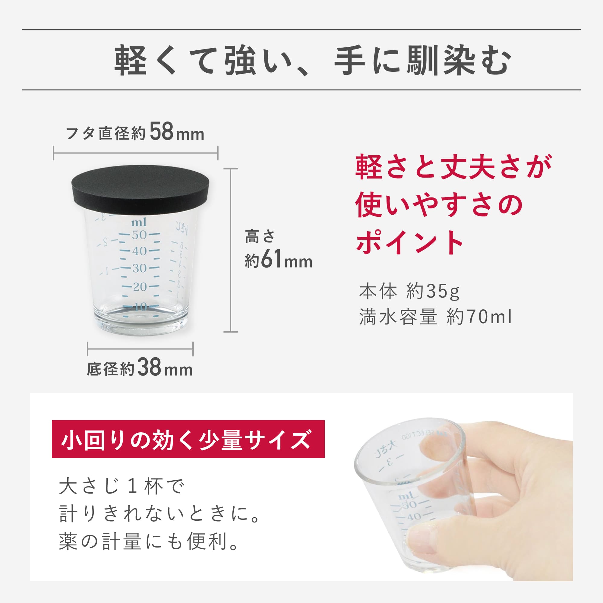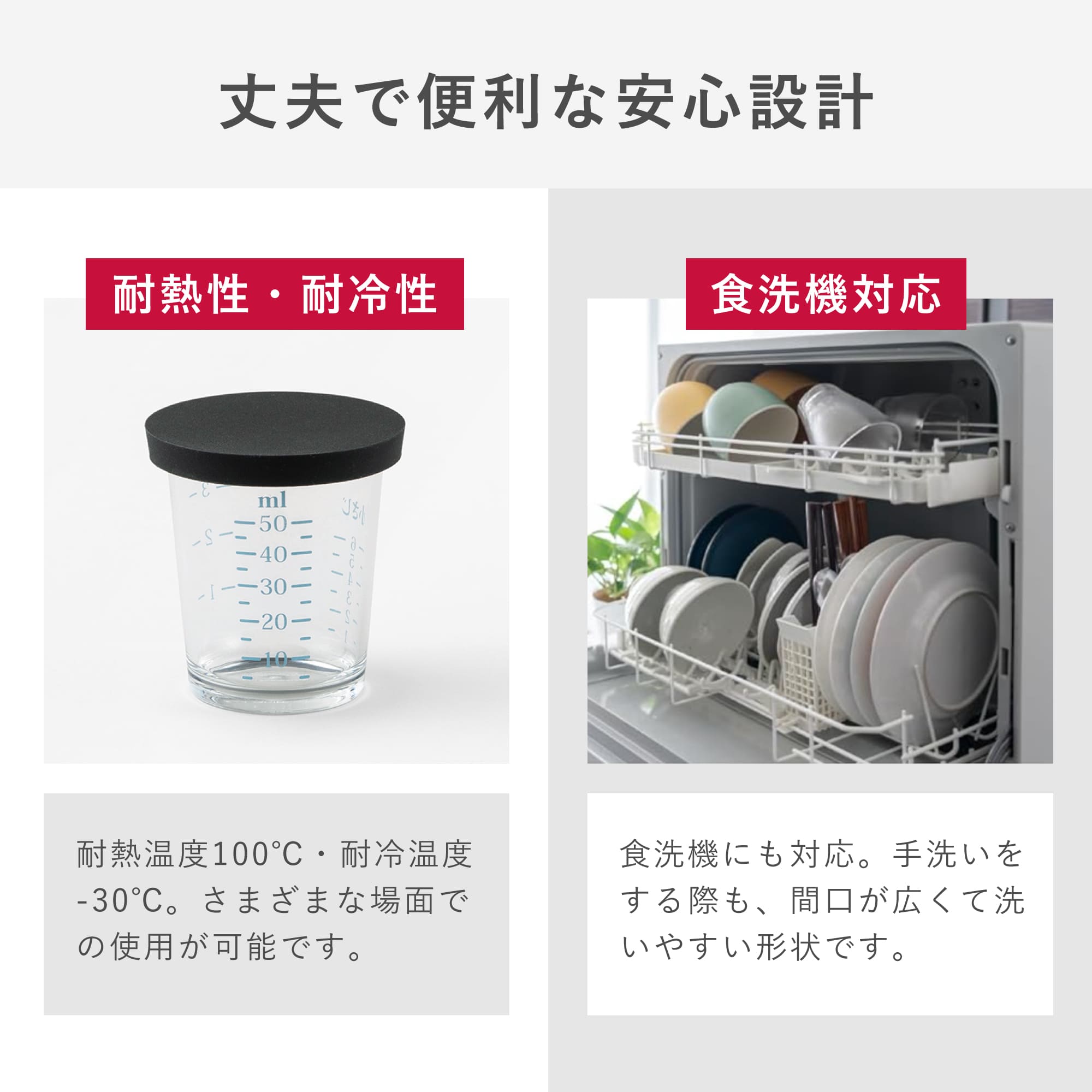 透明色・濃い色など問わず、全調味料が見やすいカラー目盛りの計量カップ。一時置きや重ね置きに便利なフタ付きです。