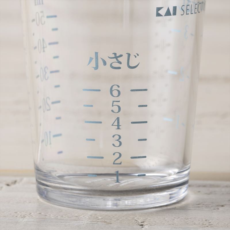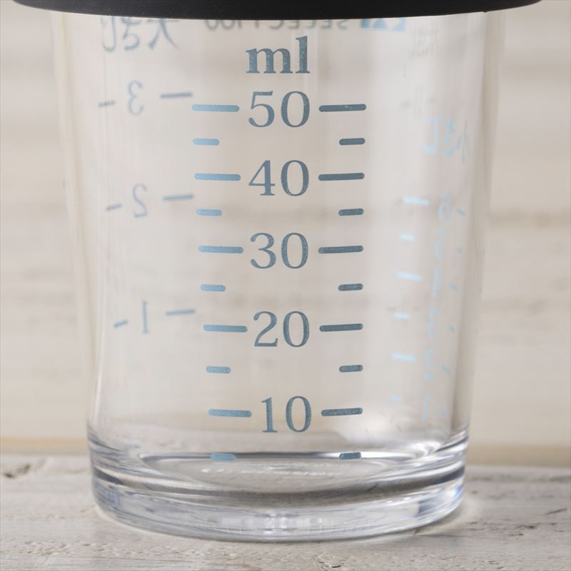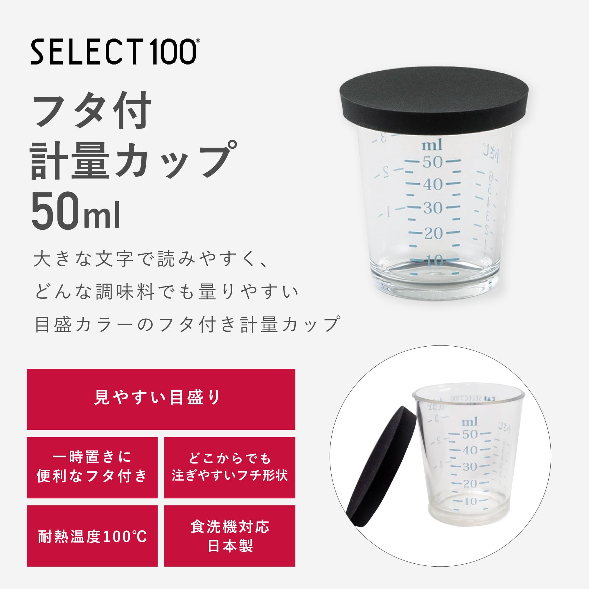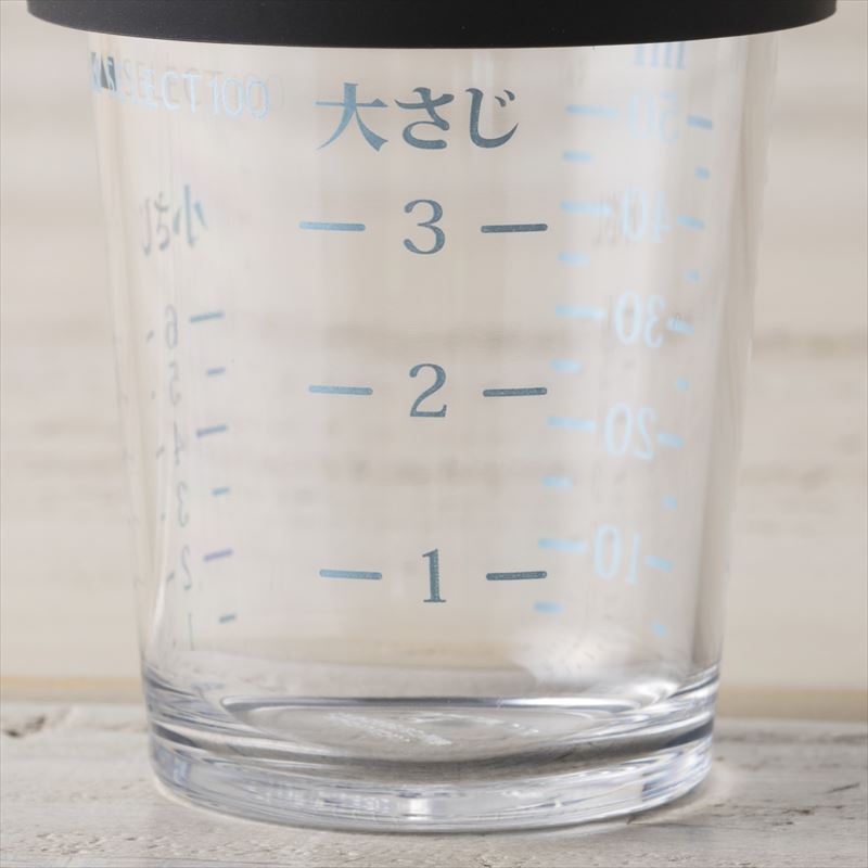 透明色・濃い色など問わず、全調味料が見やすいカラー目盛りの計量カップ。一時置きや重ね置きに便利なフタ付きです。