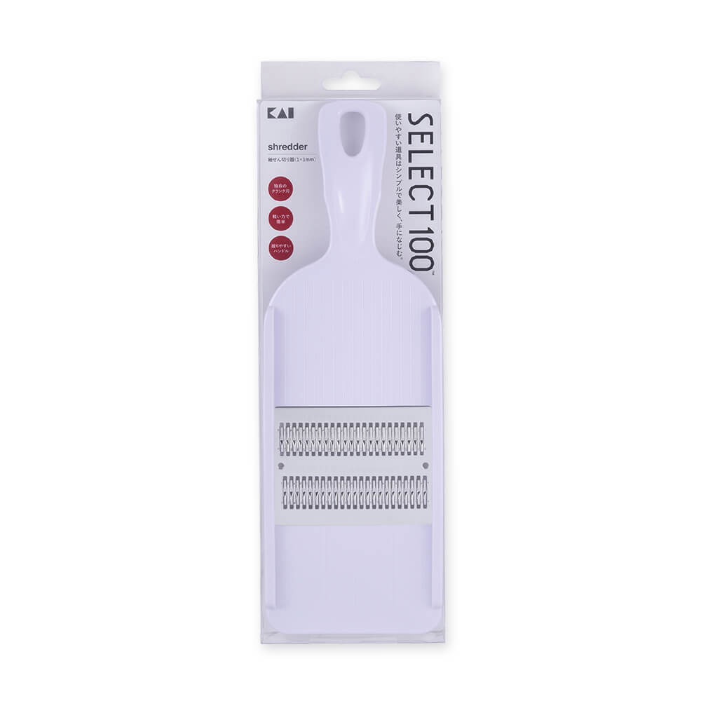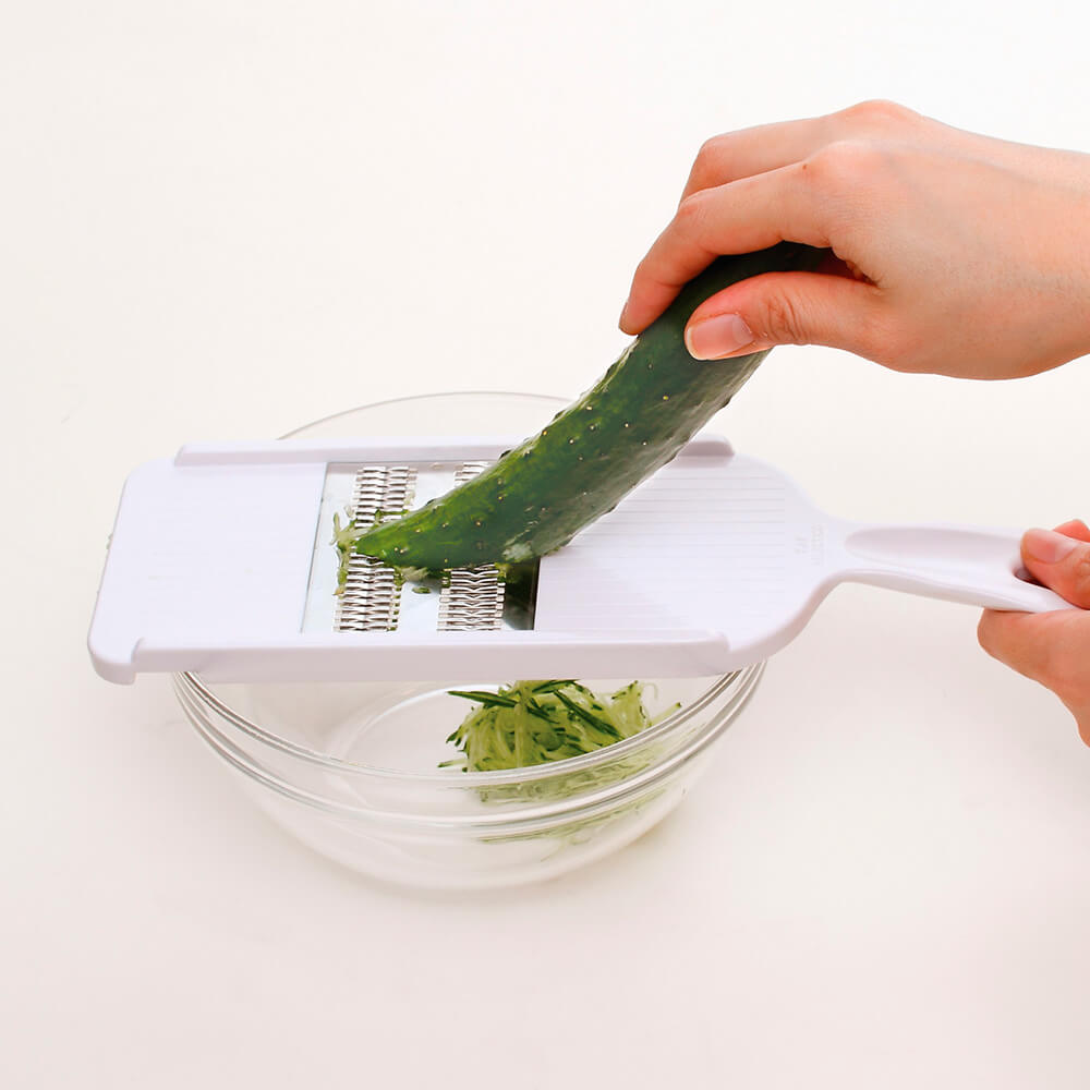 トンネル状のクランク刃を通すことで包丁で刻んだような、角のある美しい細千切り(つま程度の千切り)が簡単に仕上がります。押し引き両動作対応でとってもスピーディー!