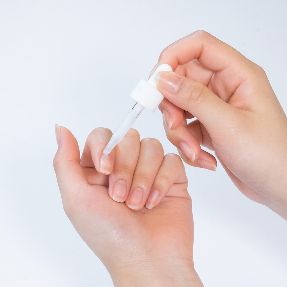 【キューティクルエッセンス】適量を爪と爪のまわりになじませます。特に乾燥の気になる部分には、たっぷりとお使いください。
