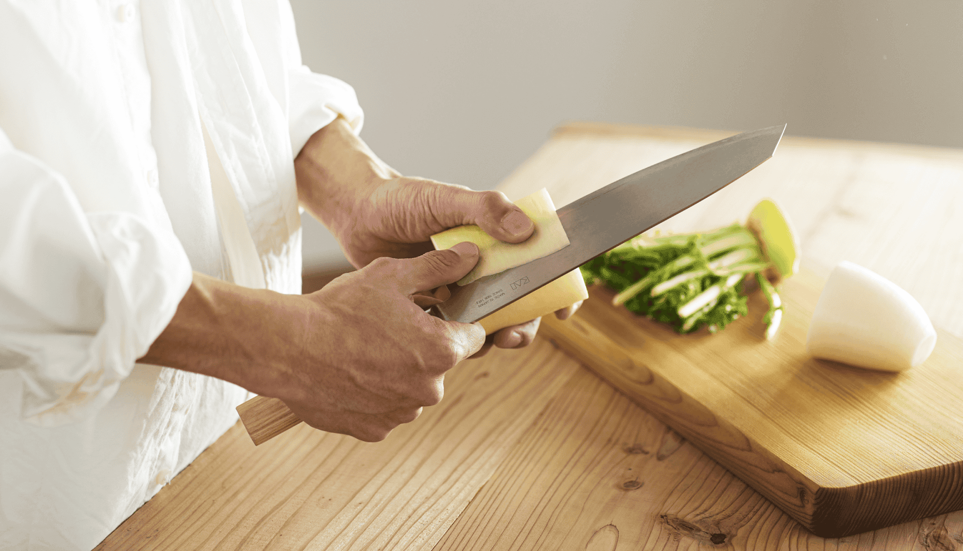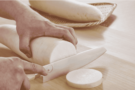 断面の美しさが、食感の滑らかさにつながります。重さのある七寸は大きな野菜も力をいれずに押し切りすることができます。