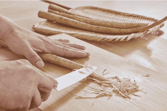 適度にばらつきのあるささがきは包丁でしかつくれません。五寸の優れた重量配合により空中での作業も、ぴたりと刃位置が決まります。