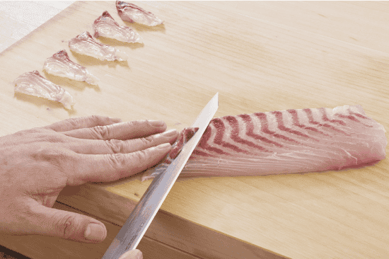 柵から刺身を引くのに適した刃渡りを採用。柵の魚をワンストロークでカットできて、お造り作りに適している他、刃が薄いので、牛肉やたたきなど、肉のスライスにも最適です。