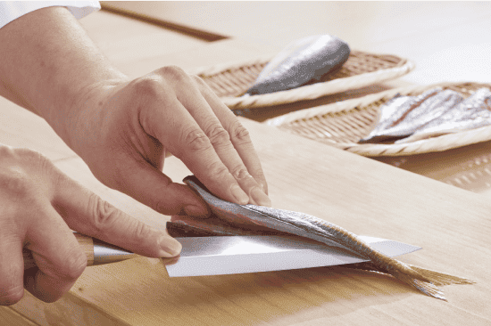 魚の三枚下ろしの際に、骨に身が残りにくいよう尖らせた切っ先形状が特徴。刃元は鶏肉や魚を骨ごと叩き切ることが可能な耐久性を実現し、つみれや粗びきのミンチも作れます。