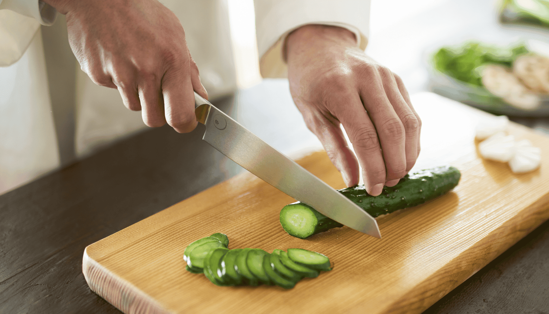 均一な深さと繊維に対する角度が見た目を左右します。取り回しの良い五寸は思い通りの場所に細かく包丁が入ります。