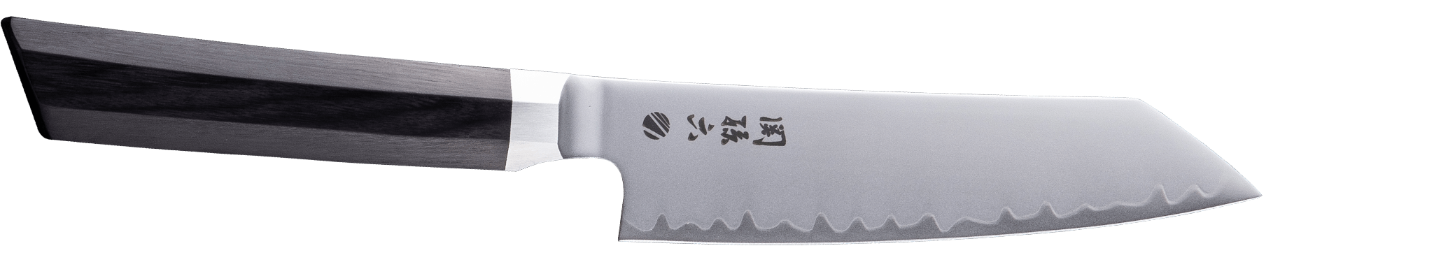 - 和包丁をルーツとする「切付」形状。剣型の刃先は、肉の筋切りや人参の飾り切り等、細かい作業がしやすく、刃体全体を使っていただける機能性を兼ね備えた形状です。