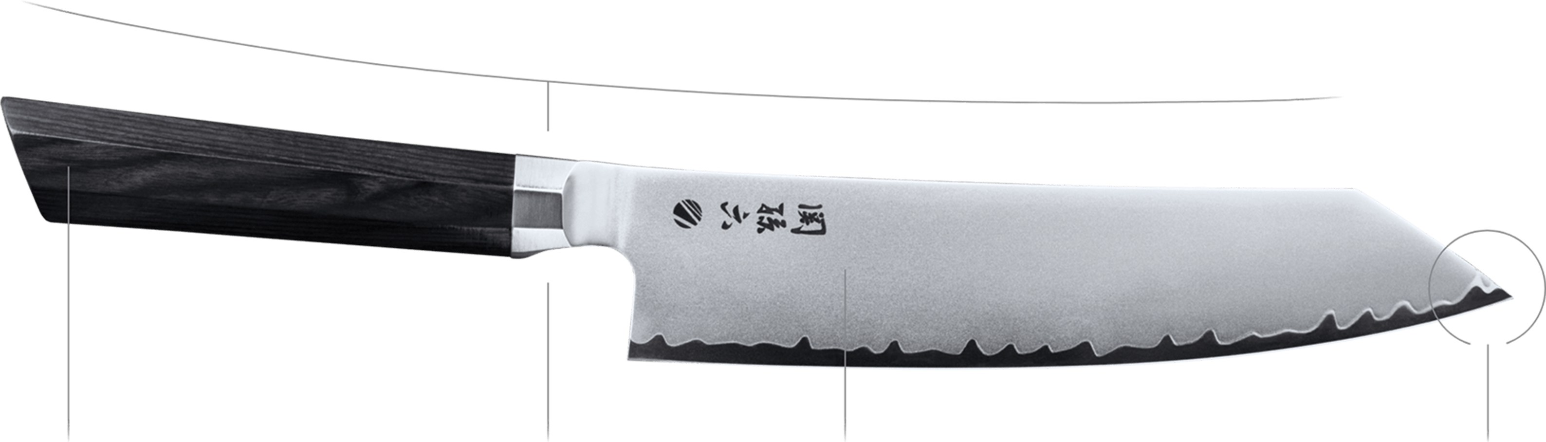 - 日本刀の形状が対象物に効率的に力が加わるという機能性に着想を得て、食材を切る作業に応用した、機能美を兼ね備えた形状です。