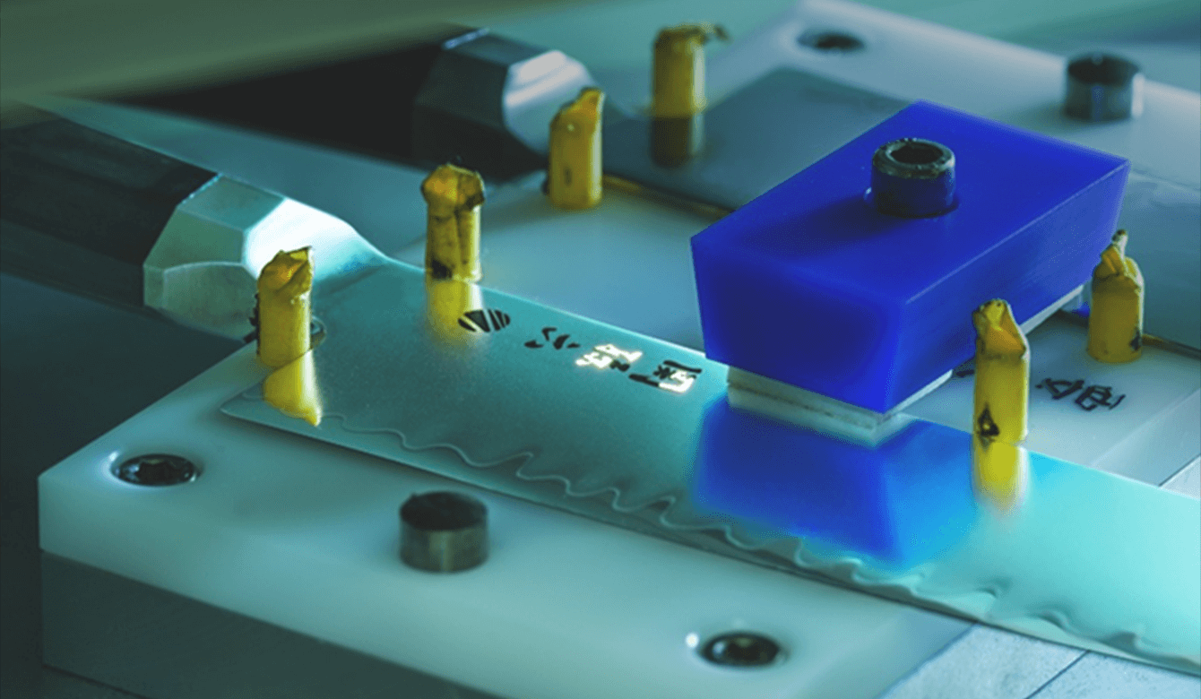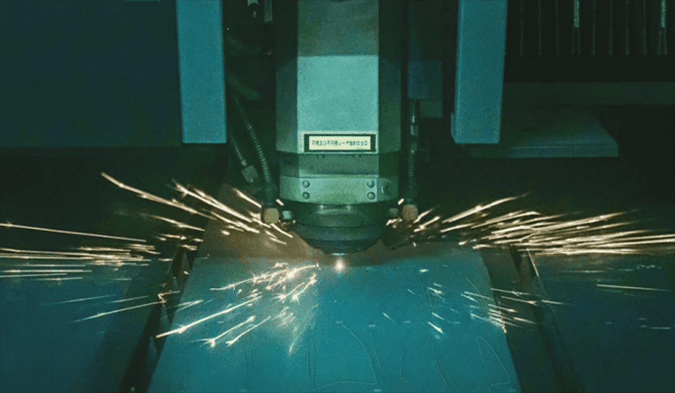 - 材料となるステンレス鋼を、包丁の刃型に合わせてレーザー光を当て切り抜いていく。レーザーによる加工はコンピュータによってプログラム制御されており、細かなデザインも正確に切り取っていく。加工スピードは金型によるプレス加工に比べ時間はかかるが、細かな意匠を要求される商品や小ロット品、試作時などにレーザー加工が活躍している。