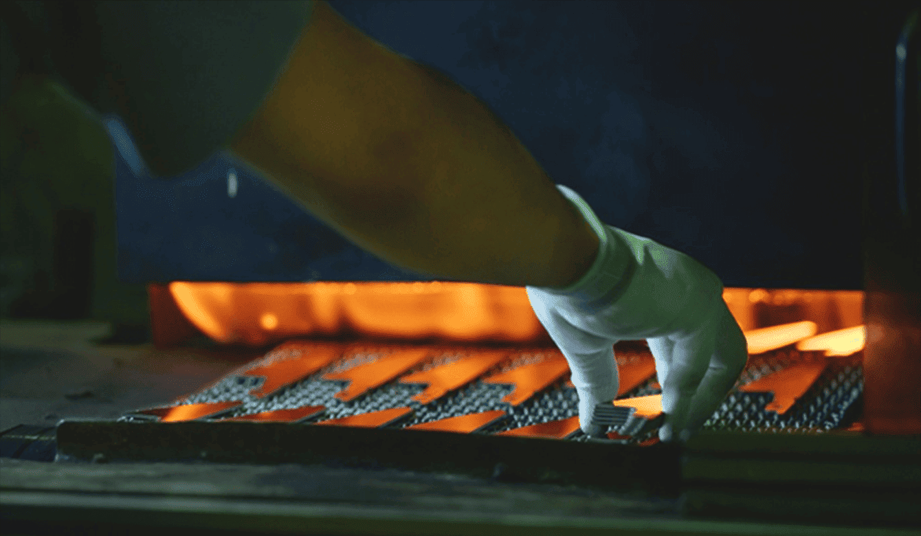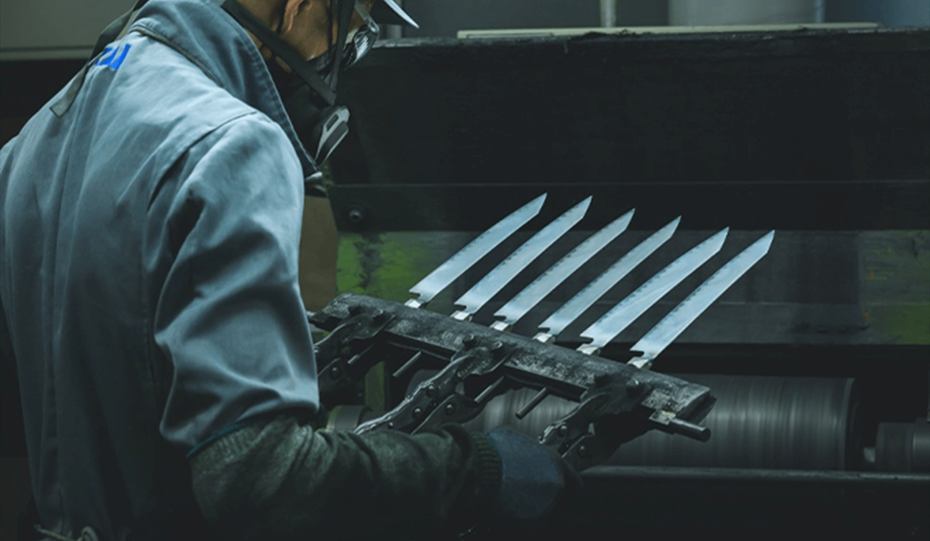 - レーザーカットされた包丁の刃体を約1000度に熱せられた電気炉のなかで加熱する。次に、冷却し、鋼材の組織が変化して硬い刃体が出来上がる。その後、硬度の均一化と経年変化の曲りや割れを防止するサブゼロ処理をするため、マイナス約80度まで冷やす。さらに再加熱することにより、硬いだけではなく粘りのある強靭な刃が出来上がる。