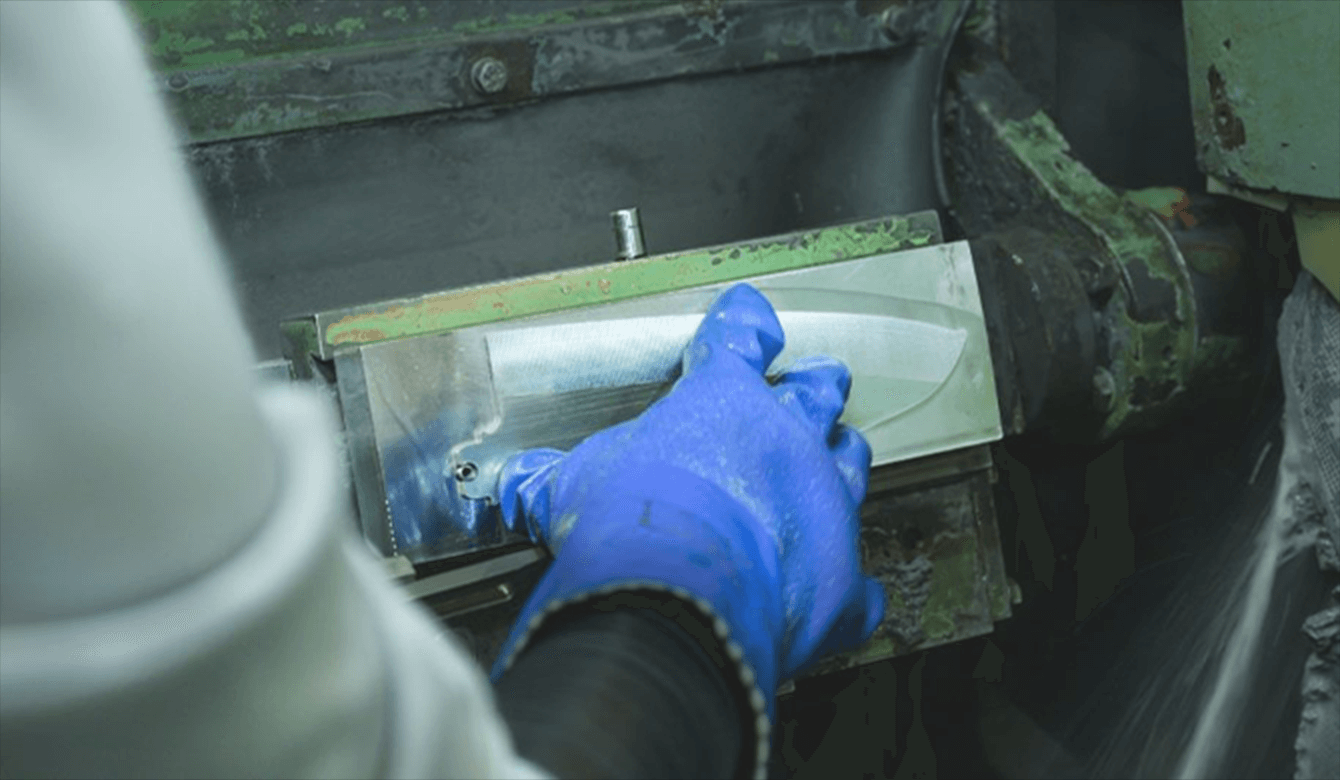 - まず刃先の部分を薄く研削する。刃均しは、特殊な研磨材によって刃先の部分を研磨し、刃体に滑らかなハマグリ形状を作る工程。その後、刃体全体をよりキメ細かく研磨をかけるグレージング工程を行なうことで、包丁全体が磨かれ綺麗な包丁の表面が出来上がる。