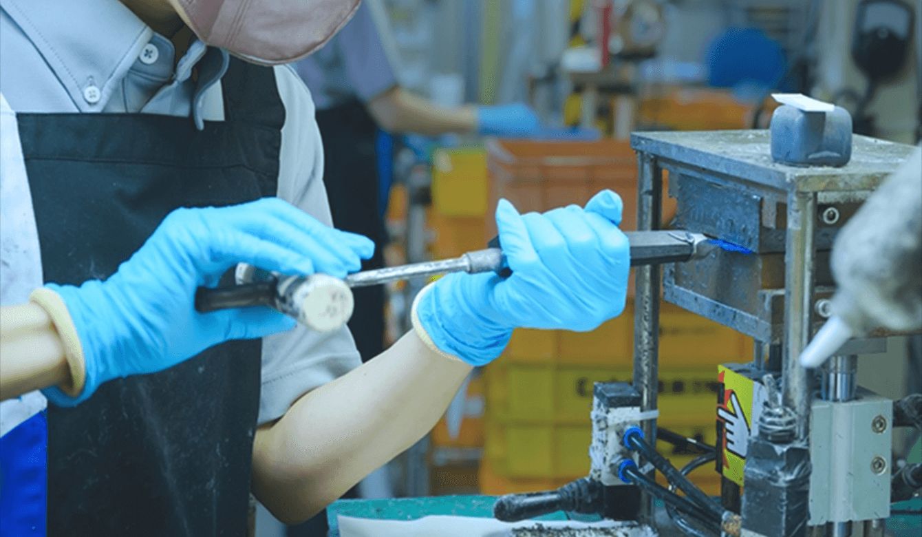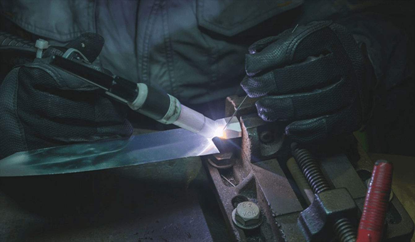 - 刃体に口金を溶接していく。口金とは包丁の持ち手部分に付いているもので、包丁本体とハンドルの結合部分を強化するための部品だ。刃体と口金を溶接して固着させることで柄の中に水が入り難くなり、柄の耐久性が増すことになる。