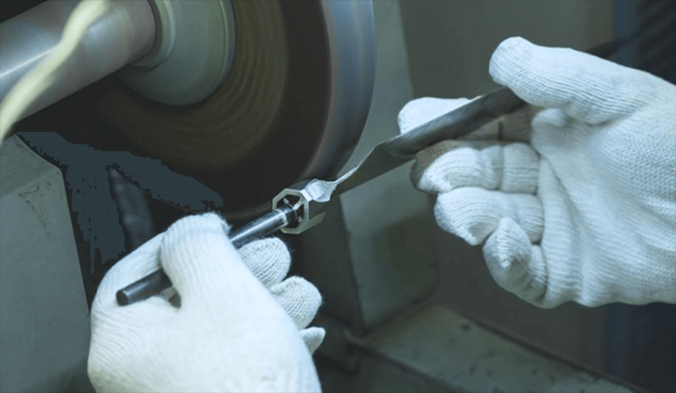 - 組み立てた包丁のハンドル部分や取り付けた口金を研磨する作業。細かな部分にある段差や表面を研磨することで、滑らかで美しいハンドルに仕上げていく。部位によって研磨するための研磨材も区別され、各部品の研磨にそれぞれ熟練した職人が担当し、作業を行なっている。