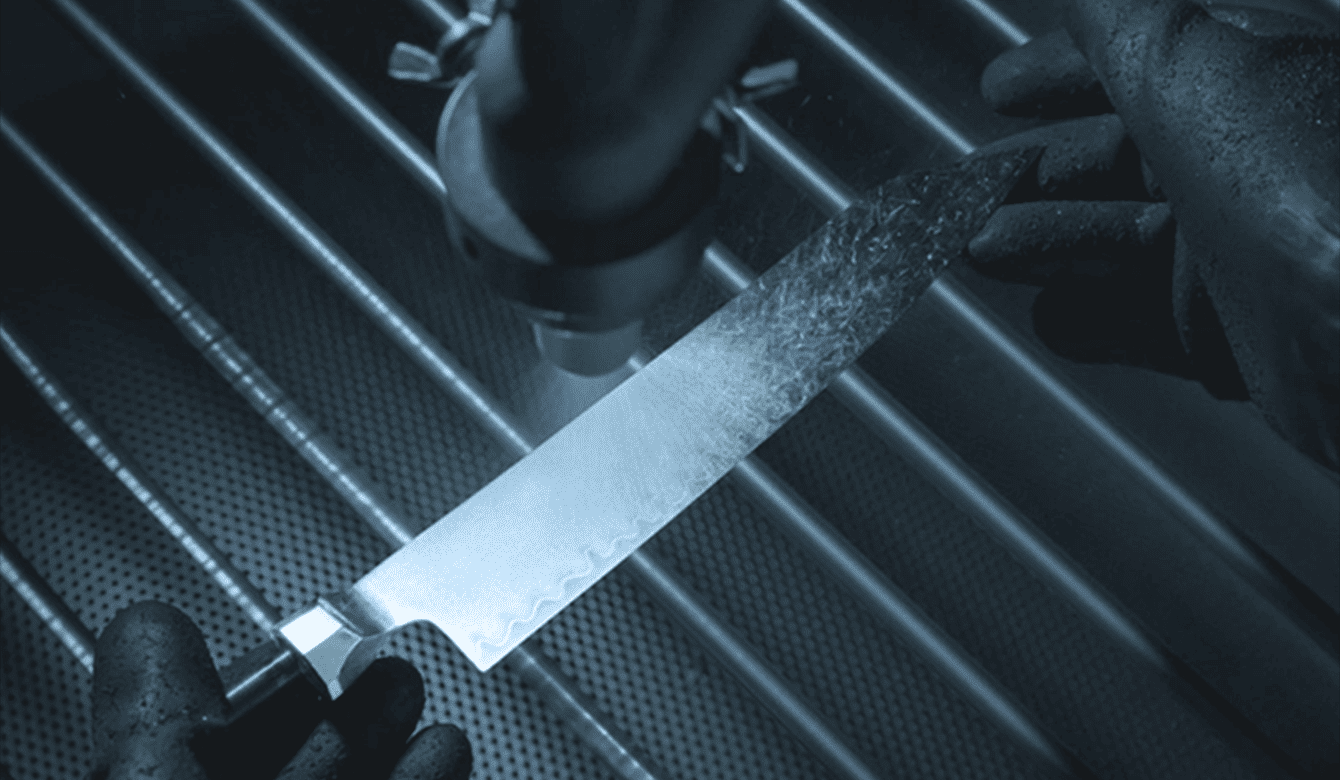 - ガラスビーズ(細かなガラスの粒子)を吹き付ける。それにより、鋼材の柔らかい部分と、硬い部分とで表面の粗さが異なり、層状の独特の模様が浮かび上がってくる。