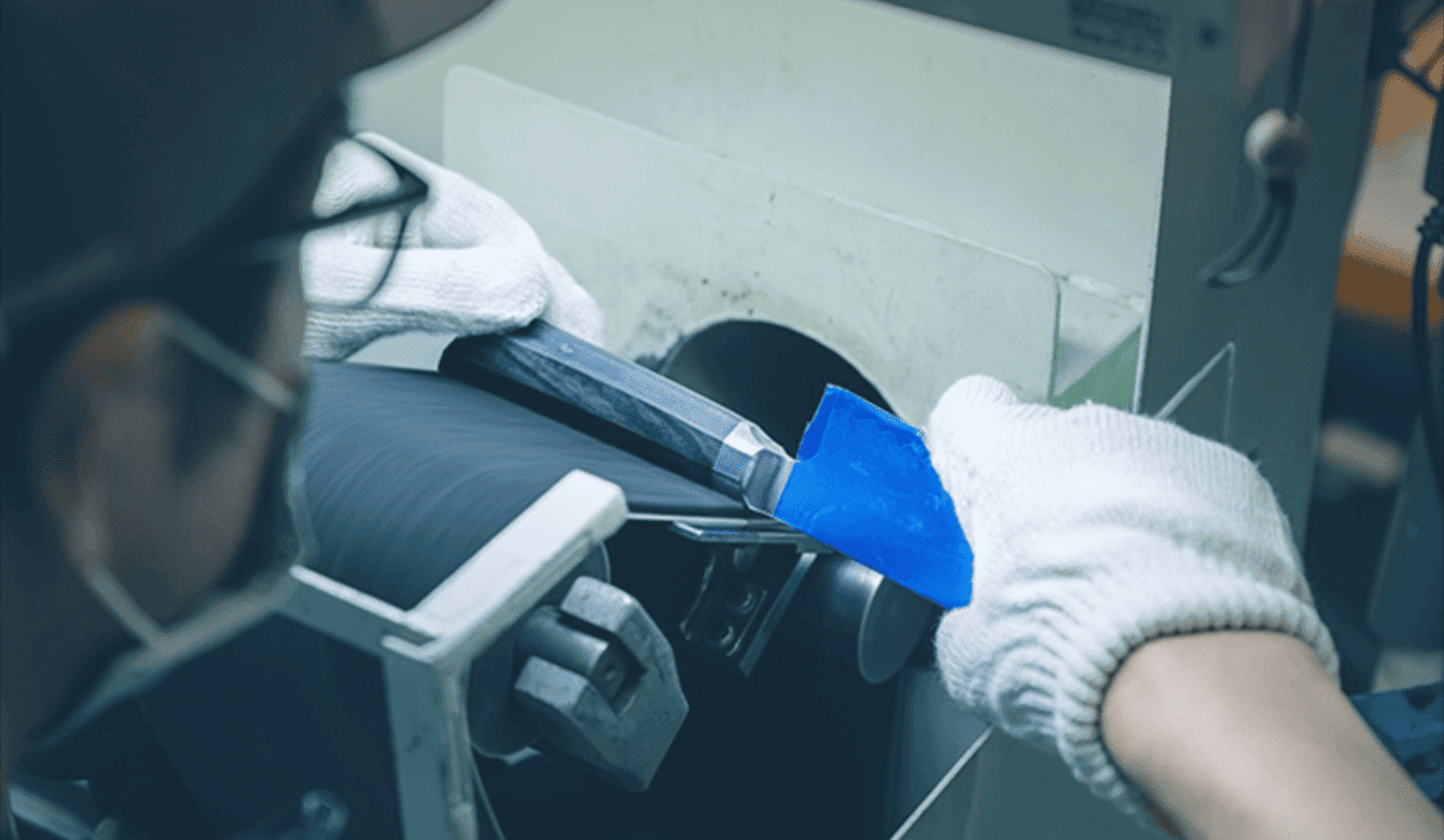 - 刃体と口金を溶接したのち、凹凸をなくすため研磨していく。最初は盛りあがっている状態が、研磨することにより指あたりが滑らかになる。
