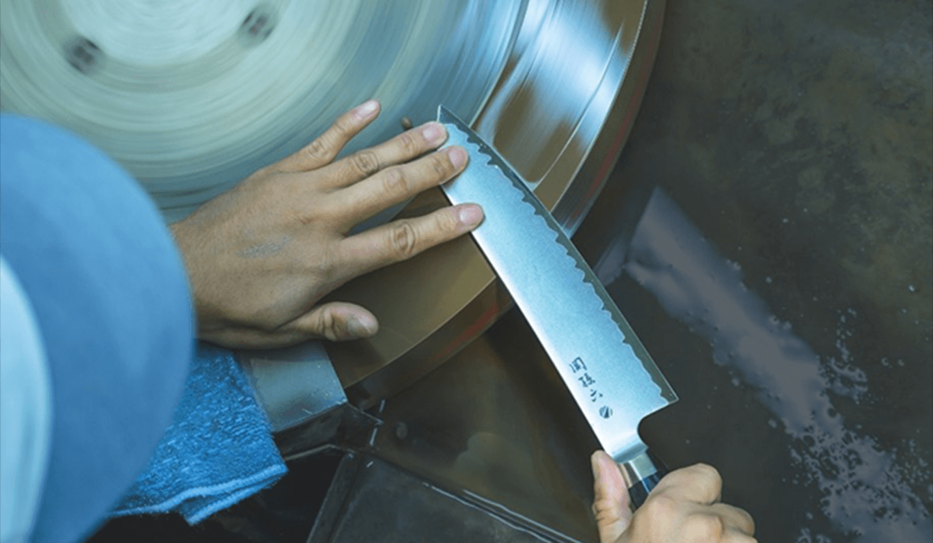 - 高級に位置づけられるラインナップには必ず用いられる刃付方法。水をかけながら行なうことで摩擦により発生する熱を発生させない刃付で、これにより刃先がよりなめらかになり、切れ味が大幅に向上する。最後になめし革でバリ(研削時にできる金属の出っ張り。返しともいう)を取ることで初めて完成された状態の包丁となる。一丁一丁刃先の切れ味をチェックしていく。