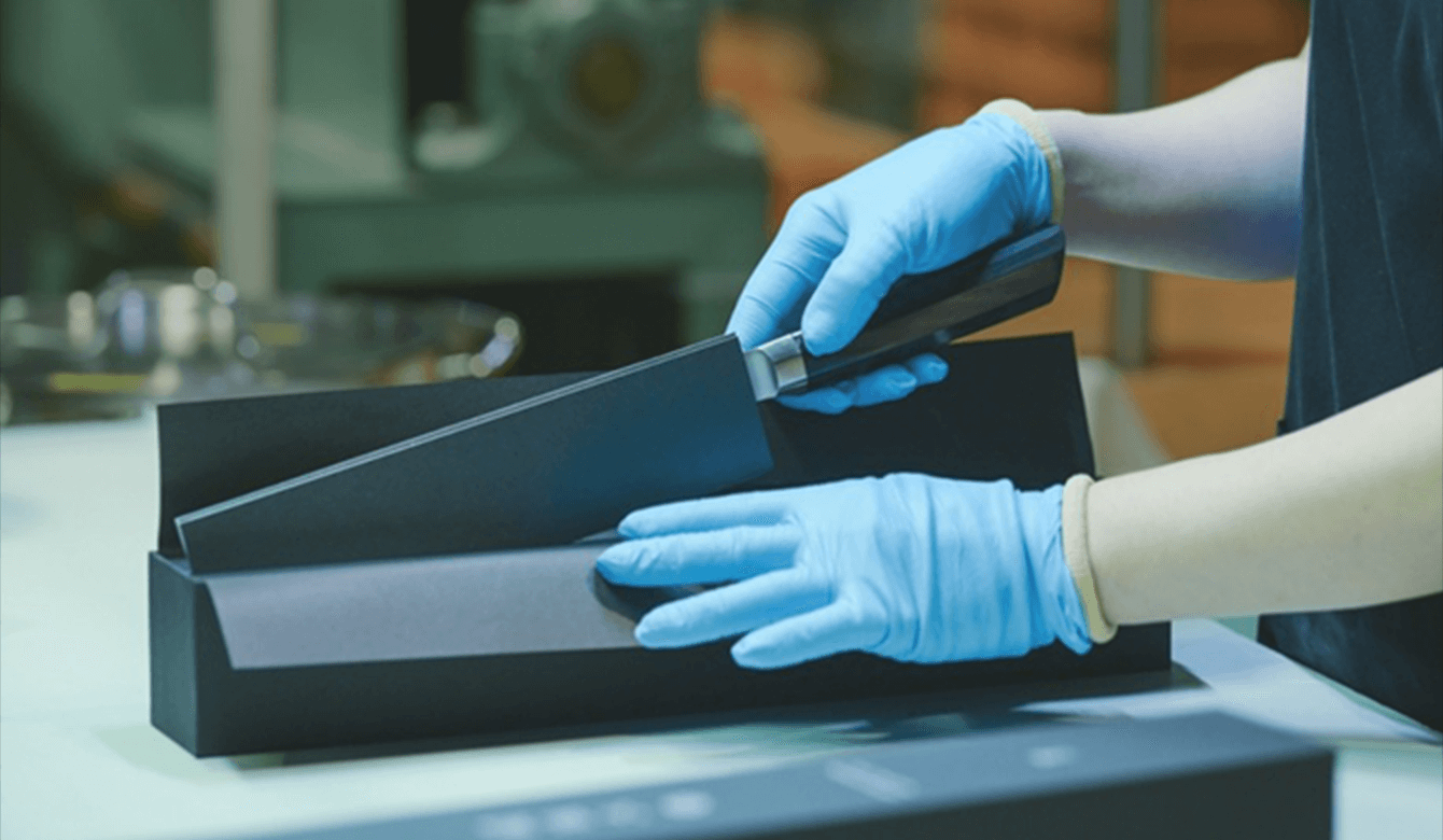 - 完成した包丁は、丁寧に箱詰めしていく。